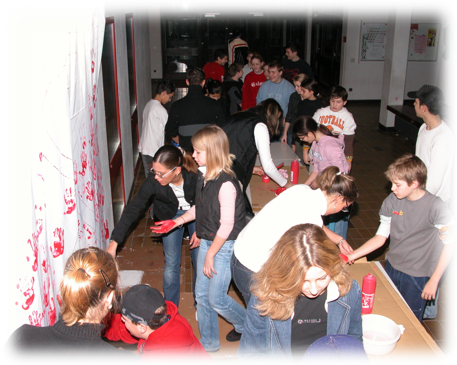2005 Aktion Rote Hand zum Red Hand Day in der Realschule Kerpen. Die 700 Schüler*innen waren begeistert dabei, die rote Farbe auf die großen Leinwände aufzutragen.