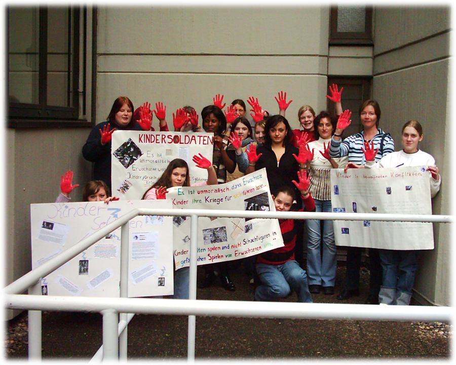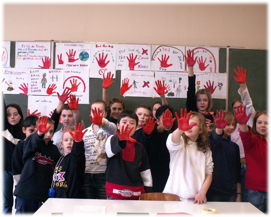 Mehr als 10.000 Kinder und Jugendliche beteiligten sich an der Aktion Rote Hand. Zwei Jahre zuvor hatten Organisationen in Kongo, Bangladesh und Kolumbien Protestaktionen mit der roten Hand als Symbol durchgeführt. Danach wurde das Symbol von den Organisationen beibehalten, der 12. Februar als Red Hand Day jedoch nicht mehr öffentlich als Tag gegen den Missbrauch von Kindern als Soldaten begangen. Mehrere Hundert Fotos von Kindern und Jugendlichen, aber auch von Erwachsenen zeigten eine rege Beteiligung. Intensive nachfragen machten den Wert für die Beteiligten deutlich, ihre Fotos auf unserer Webseite wiederzufinden. Damit hat eine Aktionsform ihre Bestatigung gefunden, die sicherlich noch ofter von uns eingesetzt wird. Die Lehrerinnen und Lehrer bestatigten, dass die Jugendlichen im Unterricht intensiver mitarbeiteten, weil sie wussten, dass am Ende eine Aktion stand.