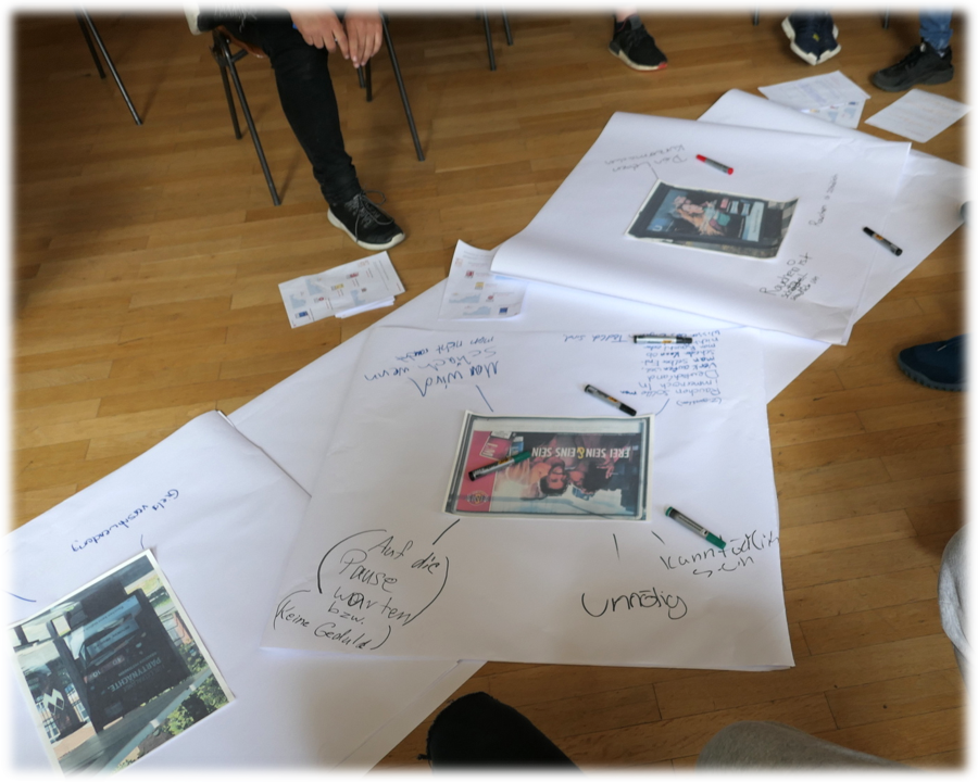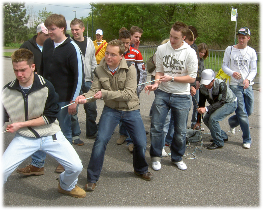 Was brauchen wir, um unsere Vorstellungen einer anderen Gesellschaft durchzusetzen. Die Jugendlichen versuchten, das Auto der Lehrerin zu bewegen und merkten, es geht nur, wenn viele mitmachen.