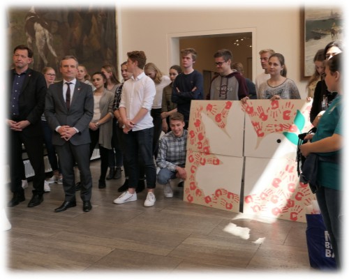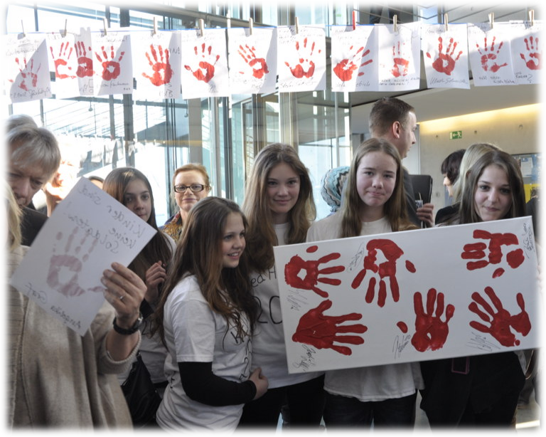 2 Schulklassen konnten 2 Tage lang die Abgeordneten des Landtages NRW auf die Situation von Kindern in Kriegen ansprechen und mit ihnen die Aktion Rote Hand machen.