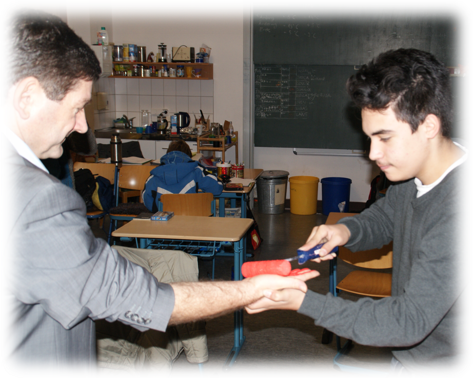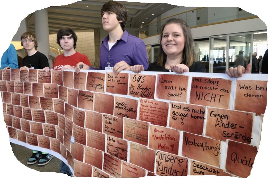 2012 konnten wir in der Förderschule Solingen fünf Workshops zu Kinderrechten durchführen. Am Ende stand die Aktion Rote Hand mit Josef Neumann, Landtagsabgeordneter der SPD. Er war von den Jugendlichen sehr beeindruckt.