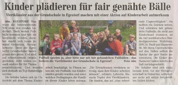 2010 mit der Aktion FAIRE LIGA waren wir in die Grundschule Egestorf in der Lüneburger Heide eingeladen über Kinderrechte zu sprechen. Für die Kinder, die unsere Fußbälle herstellen müssen, wollten sie unbedingt etwas tun.