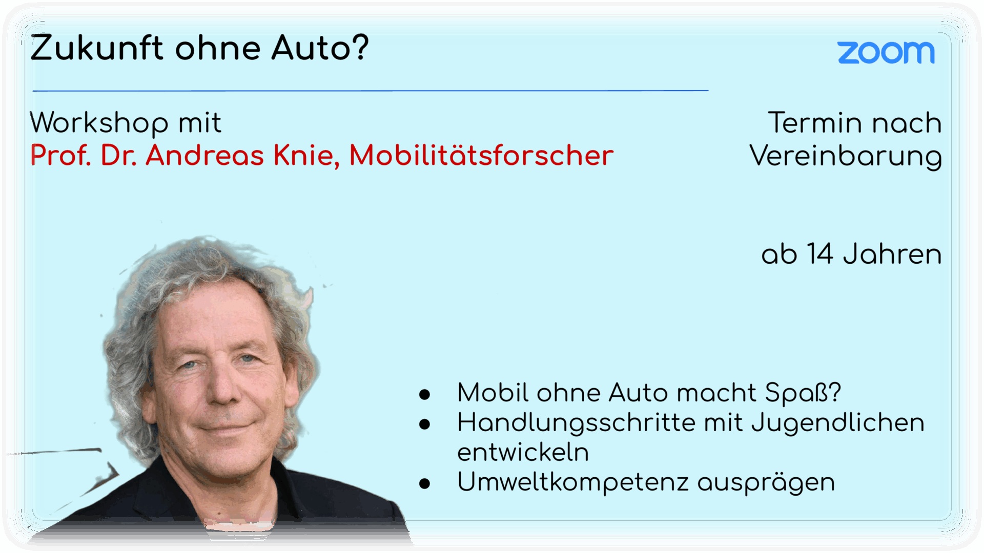 2026 Prof. Knie ist Mobilitätsforscher und wird mit Jugendlichen über die Zukunft diskutieren und was jetzt schon möglich ist. Mehr