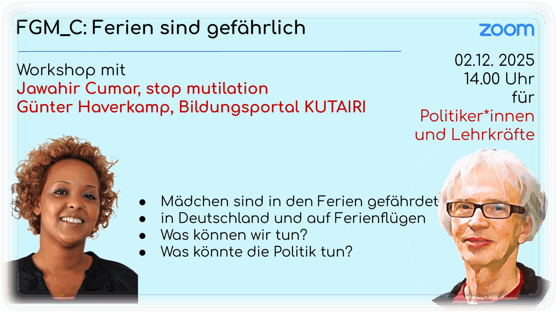 2025 Jawahir Cumar und Günter Haverrkamp informierten darüber, dass in den Ferien Mädchen besonders gefährdet sind, beschnitten zu werden. Mehr