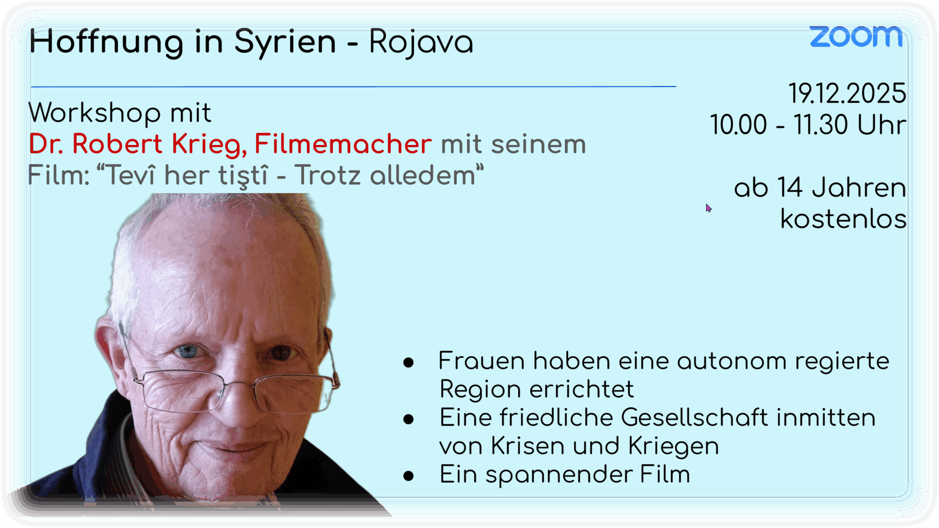 2025 Dr. Krieg hielt für eine Realschulklasse in Sachsen-Anhalt einen spannenden Vortrag mit Filmausschnitten über die politische Frauenbewegung in Syrien. Mehr