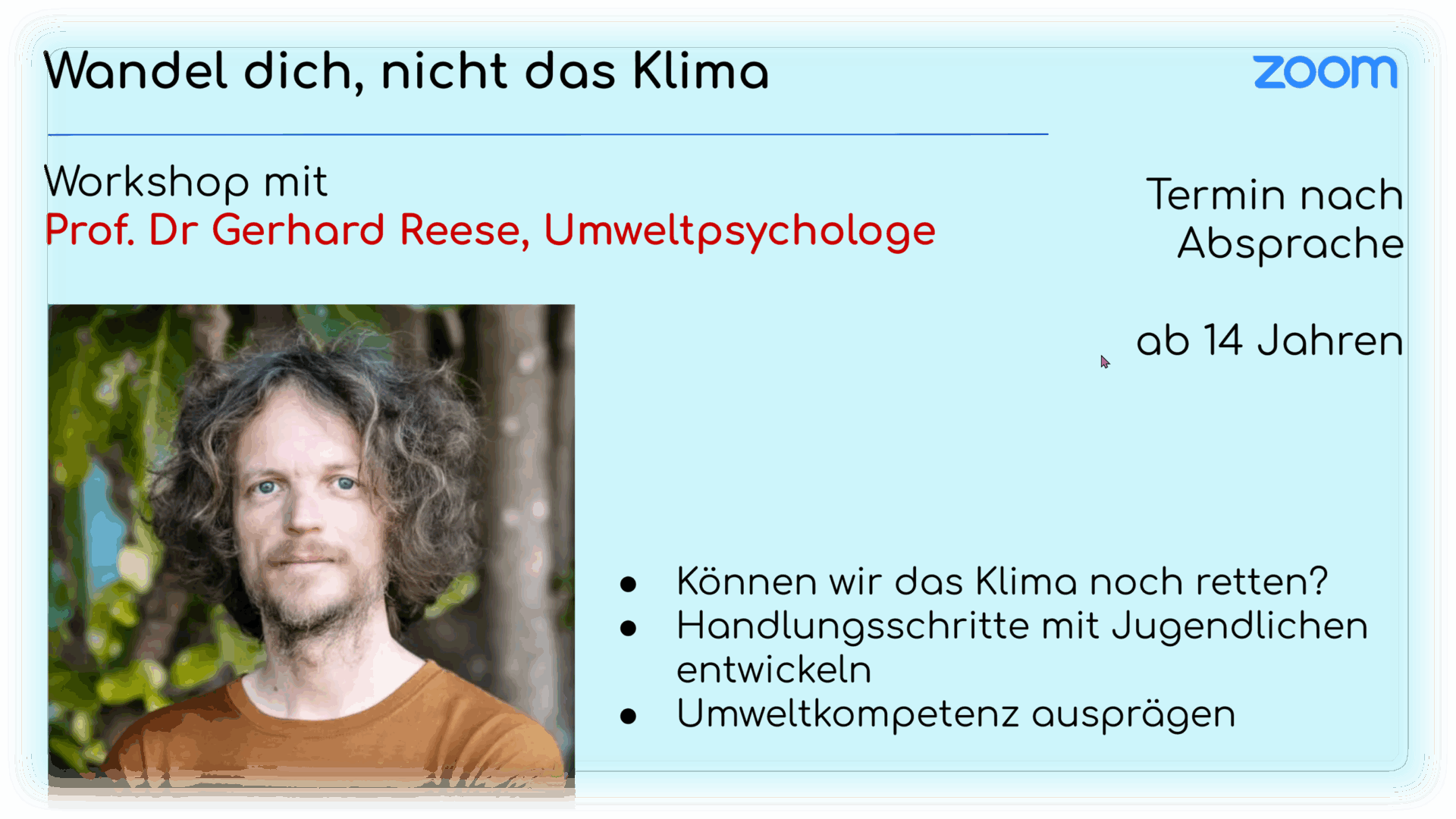 2026 Prof. Reese forscht z.Zt. in Neuseeland und ist bereit mit Schulklassen über Verhaltensänderung im Umweltbereich zu sprechen. Mehr