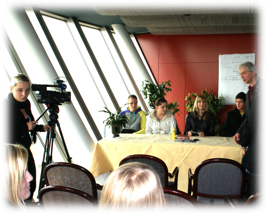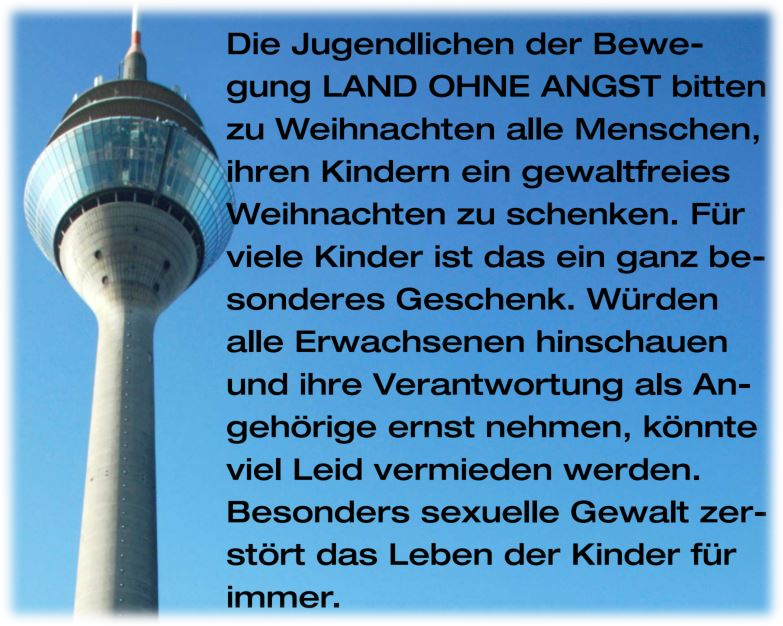 2009 LAND OHNE ANGST wurde auf dem Rheinturm in 170 m Höhe, hoch über Düsseldorf, gegründet. Die Jugendlichen verfassten eine Resolution.