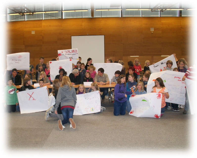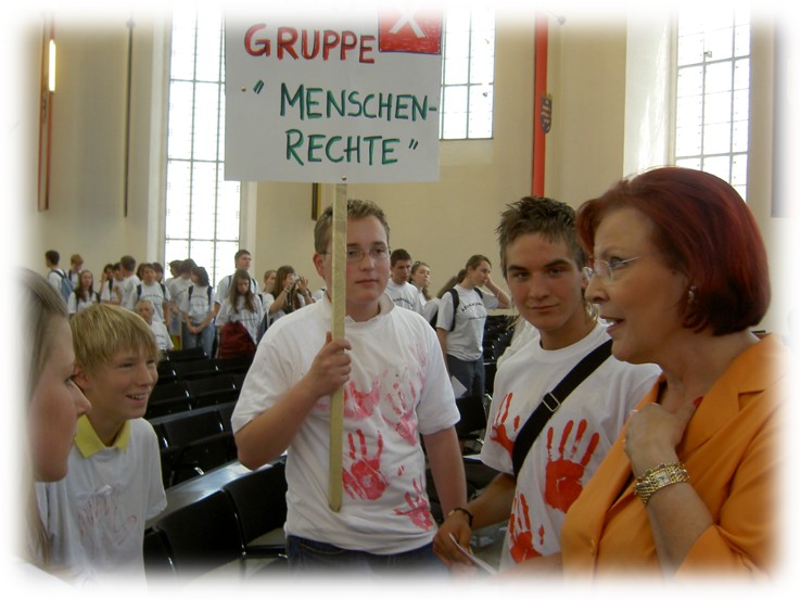 2005 organisierte die Aktivgruppe Menschenrechte gleich die größte Aktion Rote Hand des Jahres. Alle Schulen beteiligten sich und so kamen 1.300 Jugendliche auf dem Papsthügel zusammen – Minister Armin Laschet war begeistert.