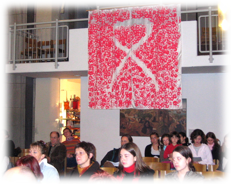 2005 organisierten wir den zweiten Red Hand Day in der Antoniterkirche Köln. Aus Kerpen kamen Schülerinnen und brachten ein riesiges Tuch mit ihren roten Händen – gerade rechtzeitig vor Beginn.
