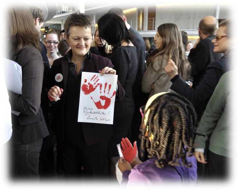 2012 Bundestag: 1. Aktionstag Kindersoldaten mit 30 Kindern, die interviewten, diskutierten und die Hände der Abgeordneten rot färbten.