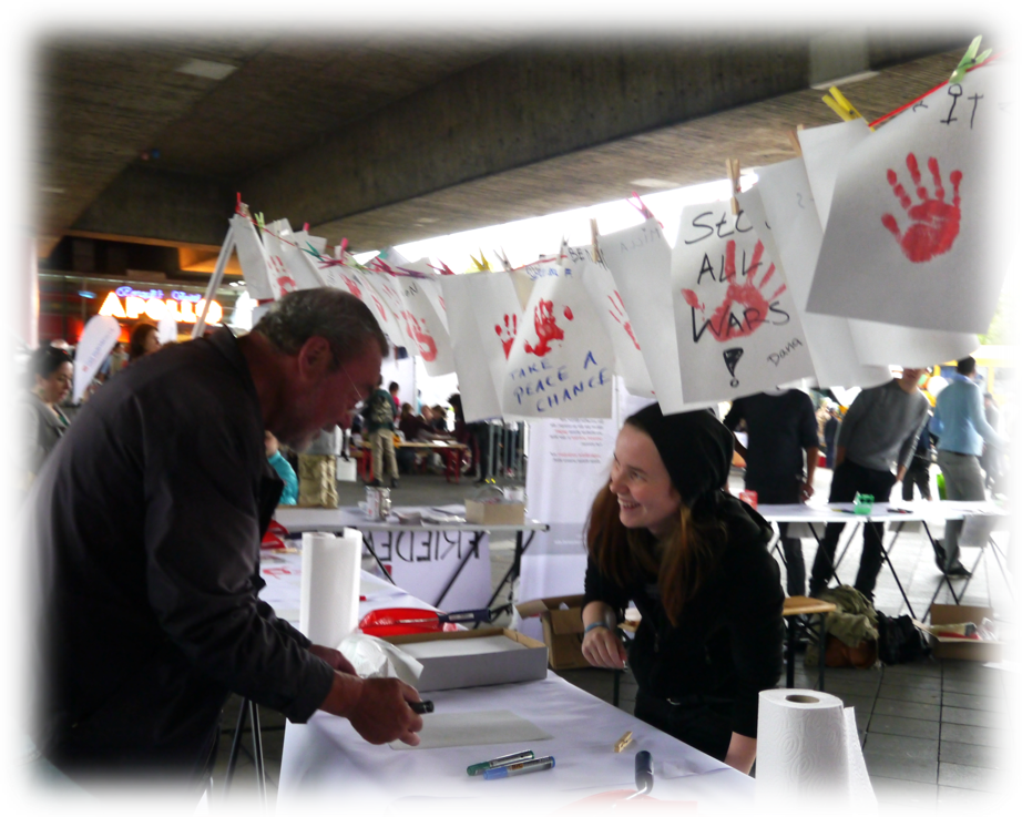 2003 rief Günter Haverkamp Kolleg*innen aus den Medien zu einer Aktion gegen den drohenden Irakkrieg zusammen. Es entstand das weiße Friedensband steht und damit eine aktionsgestützte Bildungsarbeit. Hunderte kleine und große Aktionen entwickelten wir seitdem mit Jugendlichen.
