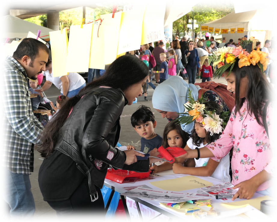 2019 Schulfest Hulda Pankok Gesamtschule Düsseldorf. Die MAUER DES SPRECHENS interessierte die Jugendlichen sehr. Lehrer Gulaziz Kizilay legt auch Hand an.