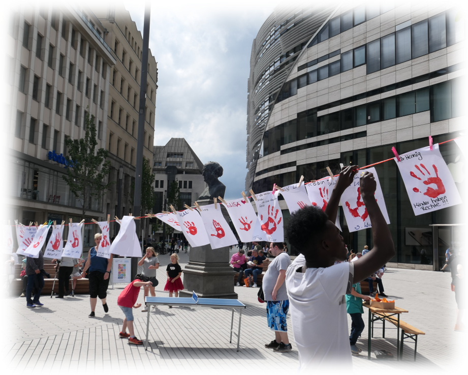 2018 Weltkindertag am Rhein. Die Aktion Rote Hand und die Malaktion machte den Kindern und unserer Crew sichtlich Spaß.