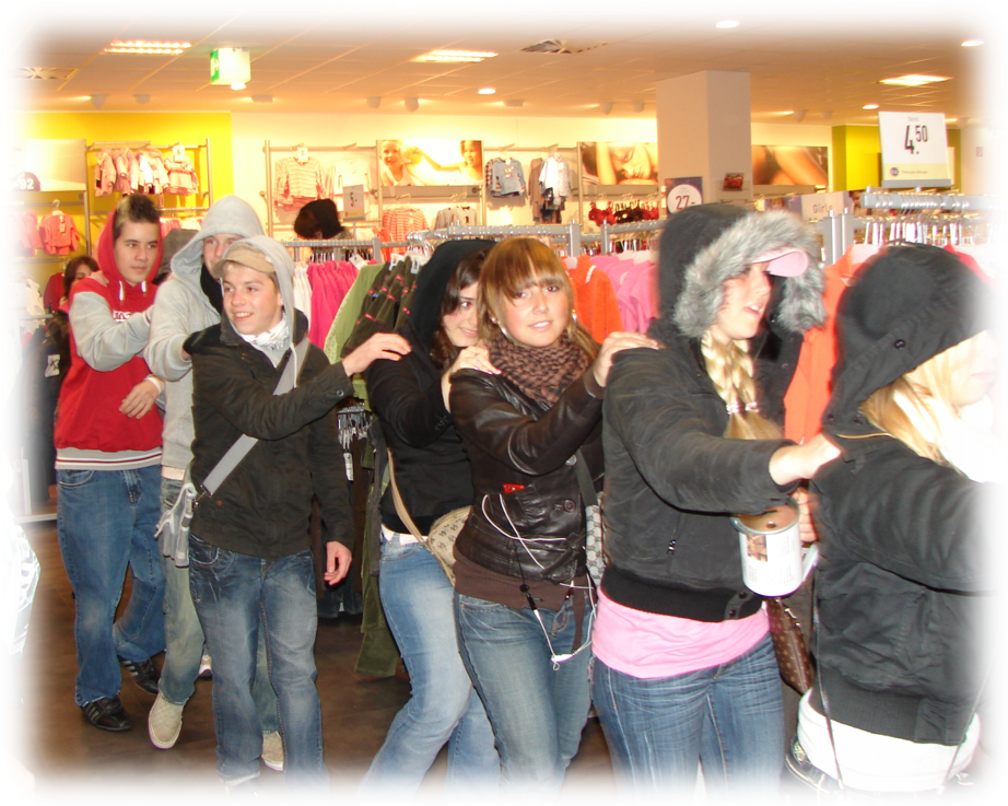 2007 Mit einem Flashmob gegen sexuelle Gewalt überraschten die Kerpener Jugendlichen die Menschen in Geschäften, Banken und Gaststätten.