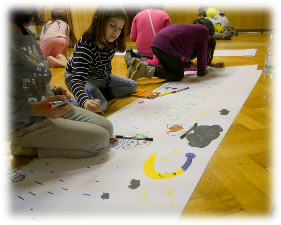 2015 Weltkindertag: Das längste Willkommensplakat entsteht – mehr als 20 Meter malen Kinder ihre guten Wünschen auf das Transparent.