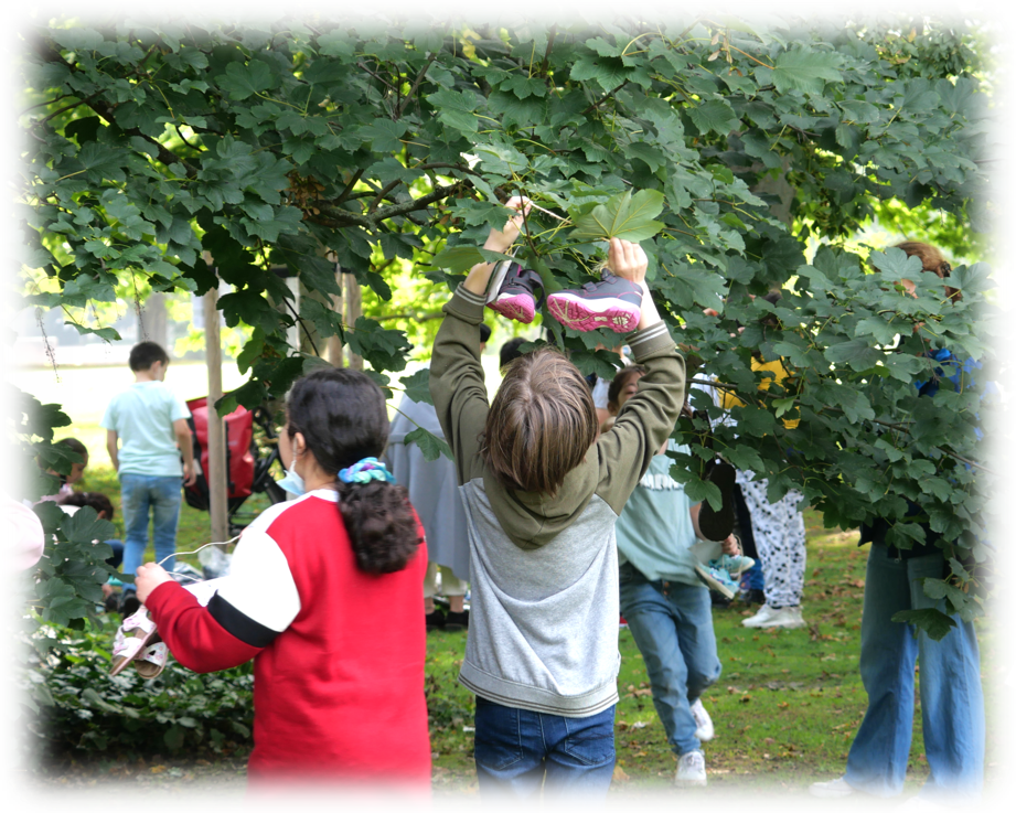 2021 Kinderschuhe mit erschütternden Botschaften in einem Baum – bei der Aktion SCHUTZBAUM machten Kinder auf ihre Not in der Corona-Zeit aufmerksam.