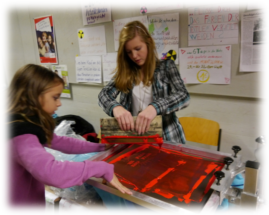 2012 Mit einer Siebdruckaktion und den selbstentworfenen T-Shirt-Designs konnten die Jugendlichen gegen ausbeuterische Arbeitsbedingungen protestieren.
