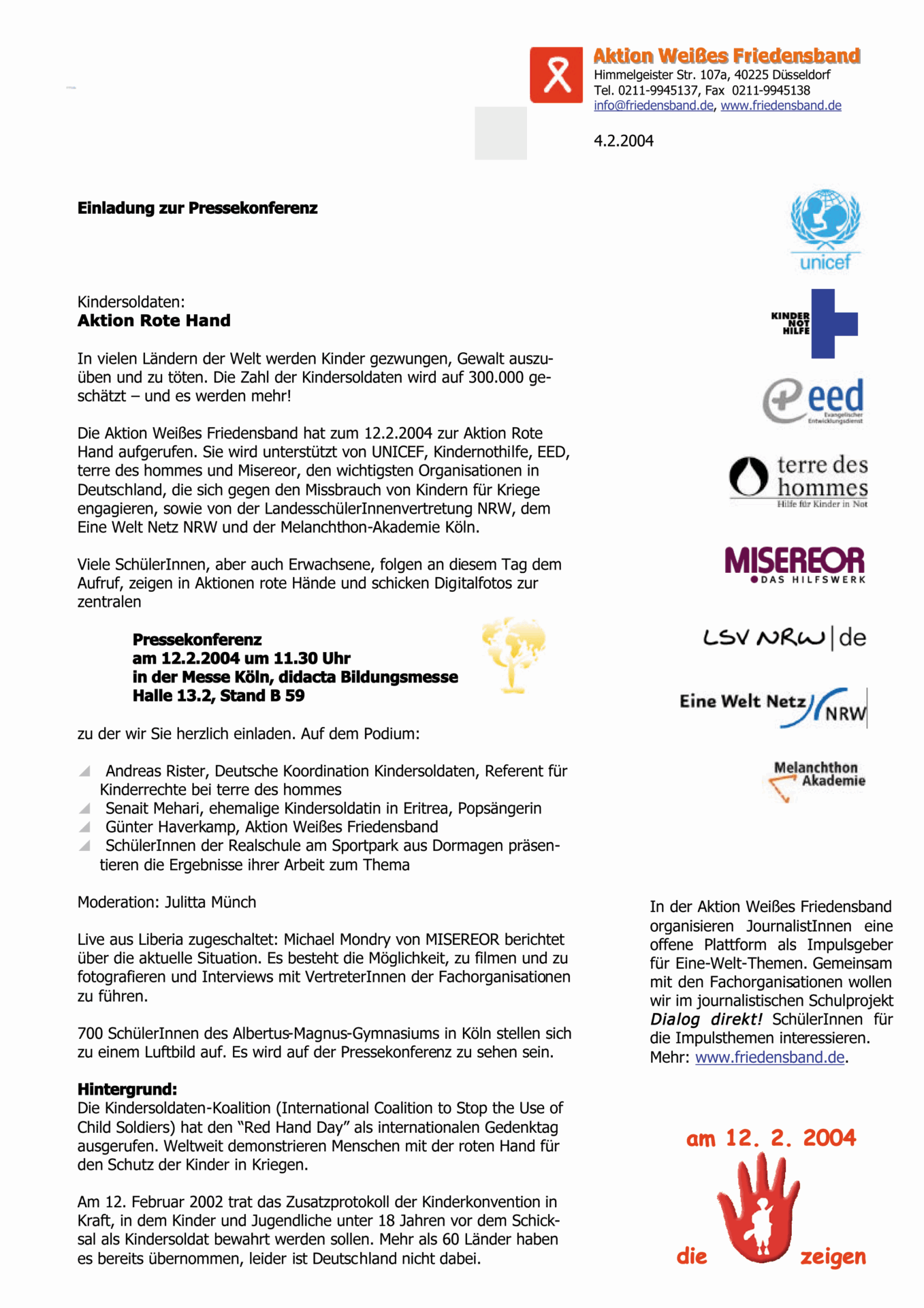 Unsere erste Bildungsaktion entstand 2003: Die Aktion Rote Hand und der Red Hand Day wurden zu einem weltweiten Erfolg, weil namhafte Organisationen die Aktionsform übernahmen.