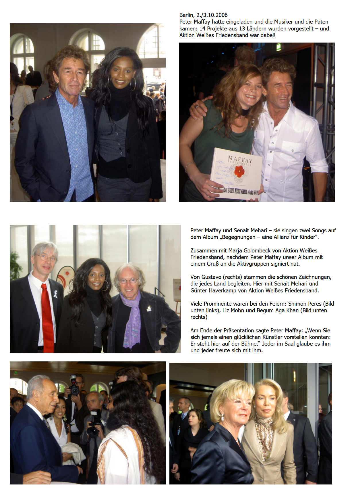 Es ist sein ehrgeizigstes Projekt: Für „Begegnungen – Eine Allianz für Kinder“ gelang es Peter Maffay auf seinen Reisen Menschen zusammen zu führen und für eine große gemeinsame Sache zu gewinnen. Eines der 14 Projekte ist Aktion Weißes Friedensband. Unsere Schirmfrau Senait Mehari singt zusammen mit Peter Maffay – Patin für uns ist Sabine Christiansen.