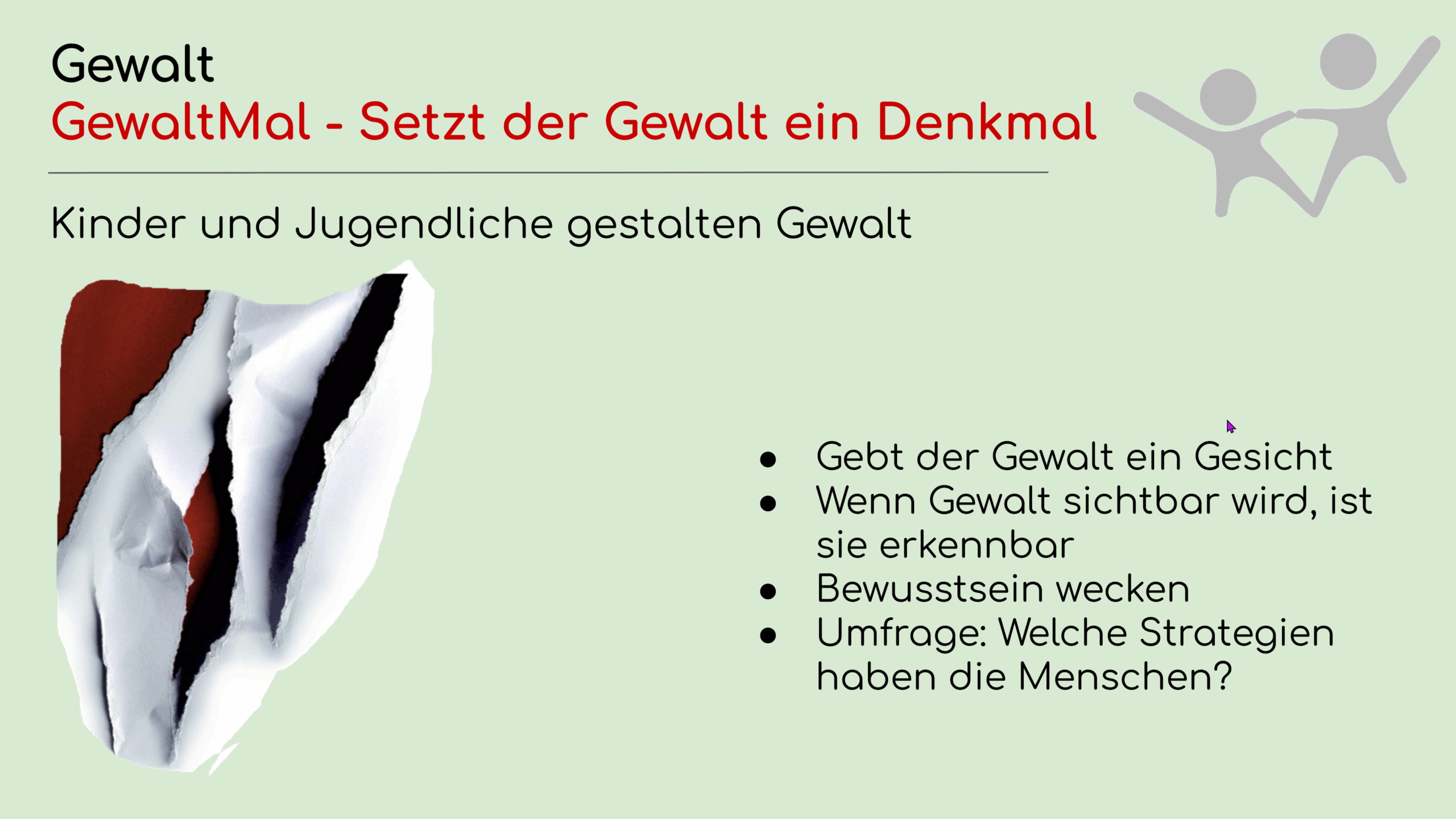 Wie sähe Gewalt aus, wenn ihr sie darstellen würdet. Es ist gleich, mit welcher Gewalt ihr euch beschäftigt. Versucht in Einzelarbeiten oder als Gruppe der Gewalt ein Gesicht, einen Körper, einen Ausdruck zu geben.  Das kann auch pantomisch oder in Szenen geschehen.