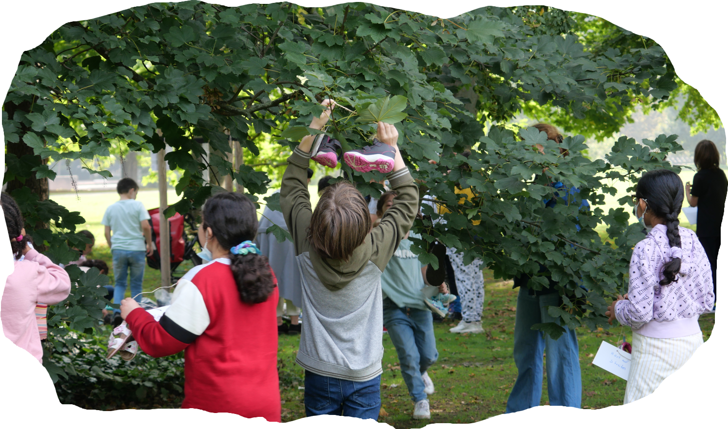 Bei unserer ersten SCHUTZBAUM bestätigte sich, was wir schon vorher ahnten: Kinderschuhe in Bäumen ziehen Menschen wie magisch an.