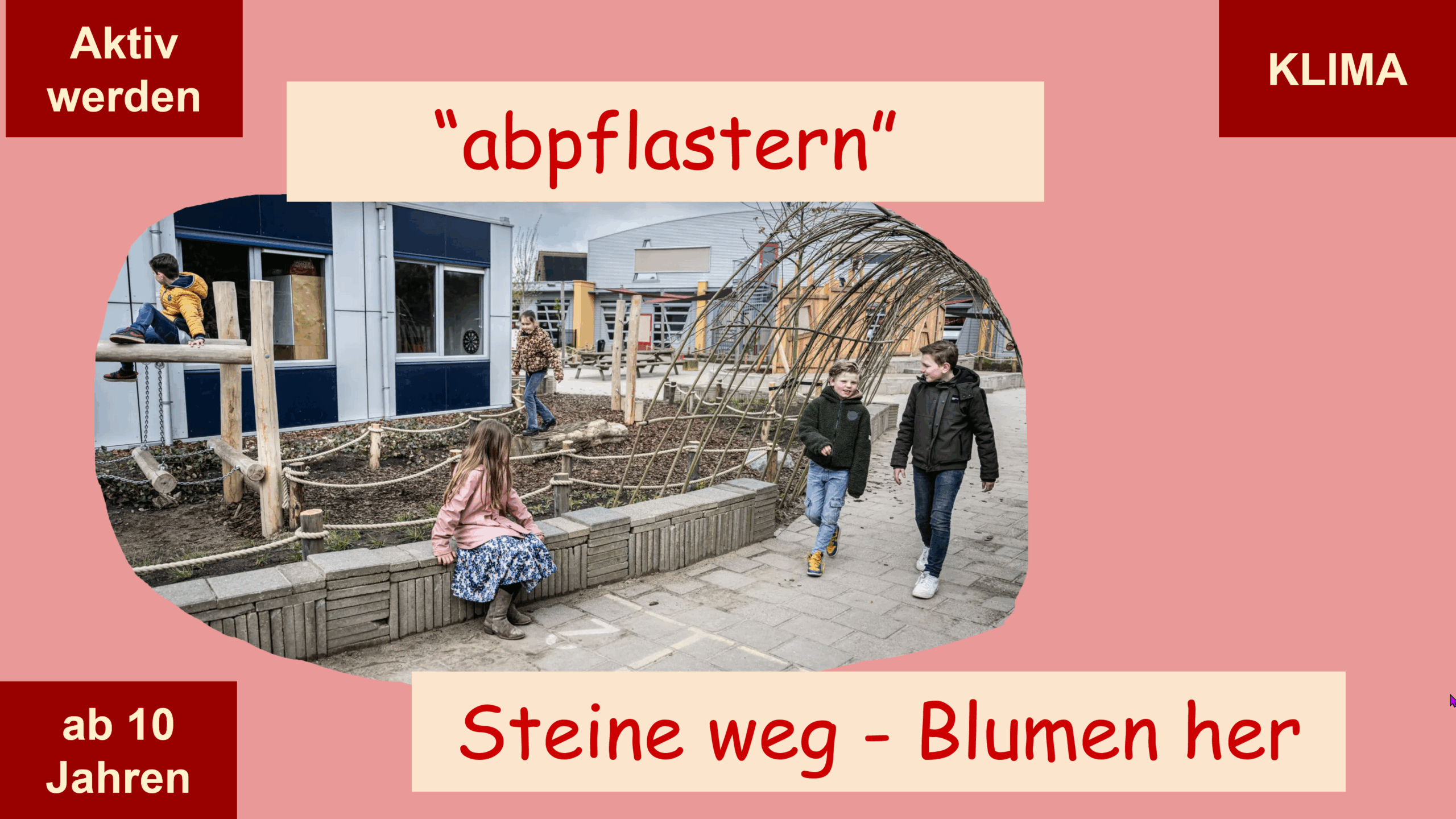 abpflastern ist ein deutschlandweiter Wettbewerb, bei dem Städte und Gemeinden in einem freundschaftlichen Wettstreit Flächen entsiegeln. Beim abpflastern nehmen Anwohner:innen und Kommunen gemeinsam die Schippe in die Hand – für den Sieg im Wettbewerb und für die Zukunft ihres Wohnortes.