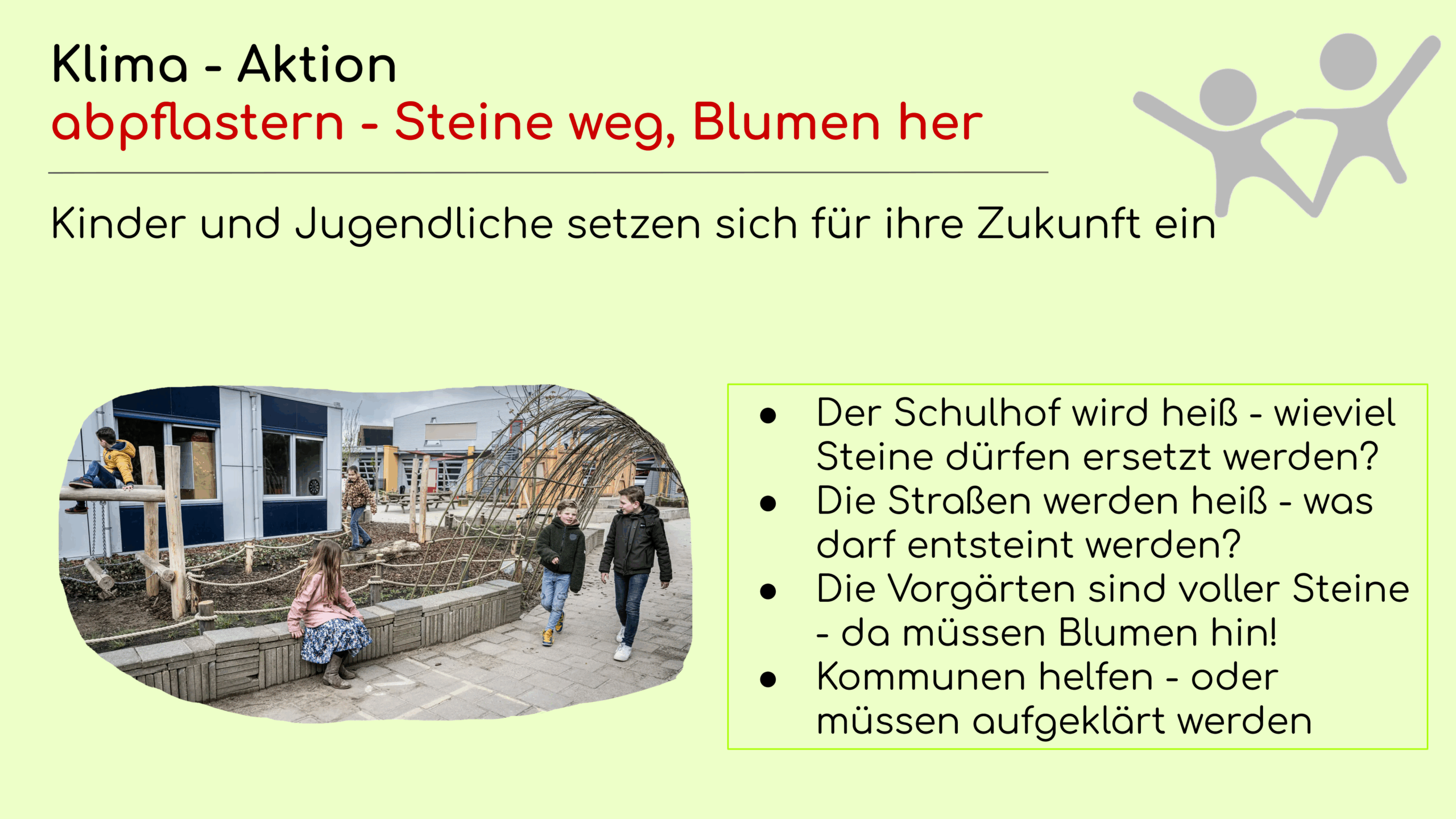 abpflastern ist ein deutschlandweiter Wettbewerb, bei dem Städte und Gemeinden in einem freundschaftlichen Wettstreit Flächen entsiegeln. Beim abpflastern nehmen Anwohner:innen und Kommunen gemeinsam die Schippe in die Hand – für den Sieg im Wettbewerb und für die Zukunft ihres Wohnortes.