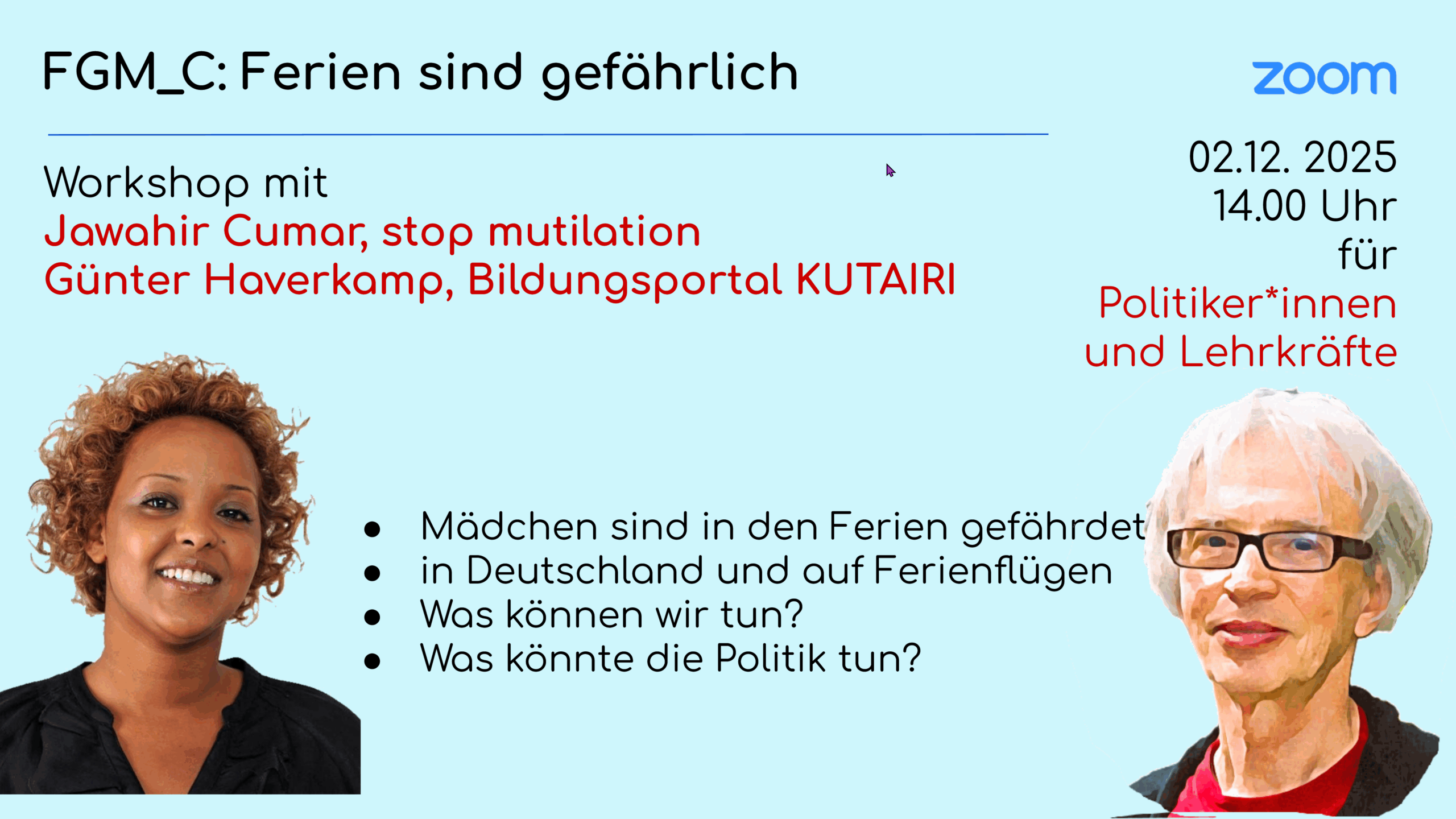 Weibliche Genitalbeschneidung ist eine schwere Menschenrechtsverletzung. Oft sind schon Mädchen unter einem Jahr betroffen. Warum und was das für uns bedeutet, beleuchten wir in diesem Seminar.