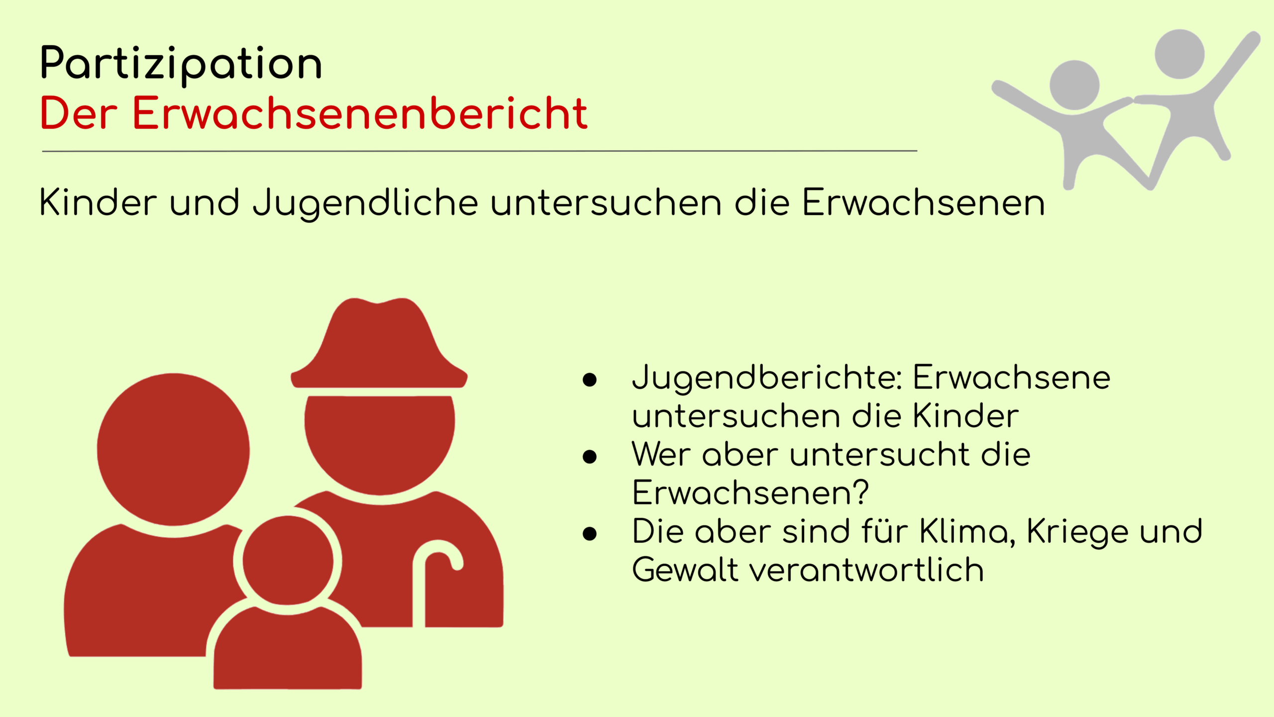 Im Erwachsenenbericht wird die Situation umgekehrt. Die Jugendlichen untersuchen das Verhalten und Handeln der Erwachsenen und bewerten es. Dabei könnte sich ein für beide Seiten fruchtbarer Prozess entwickeln.