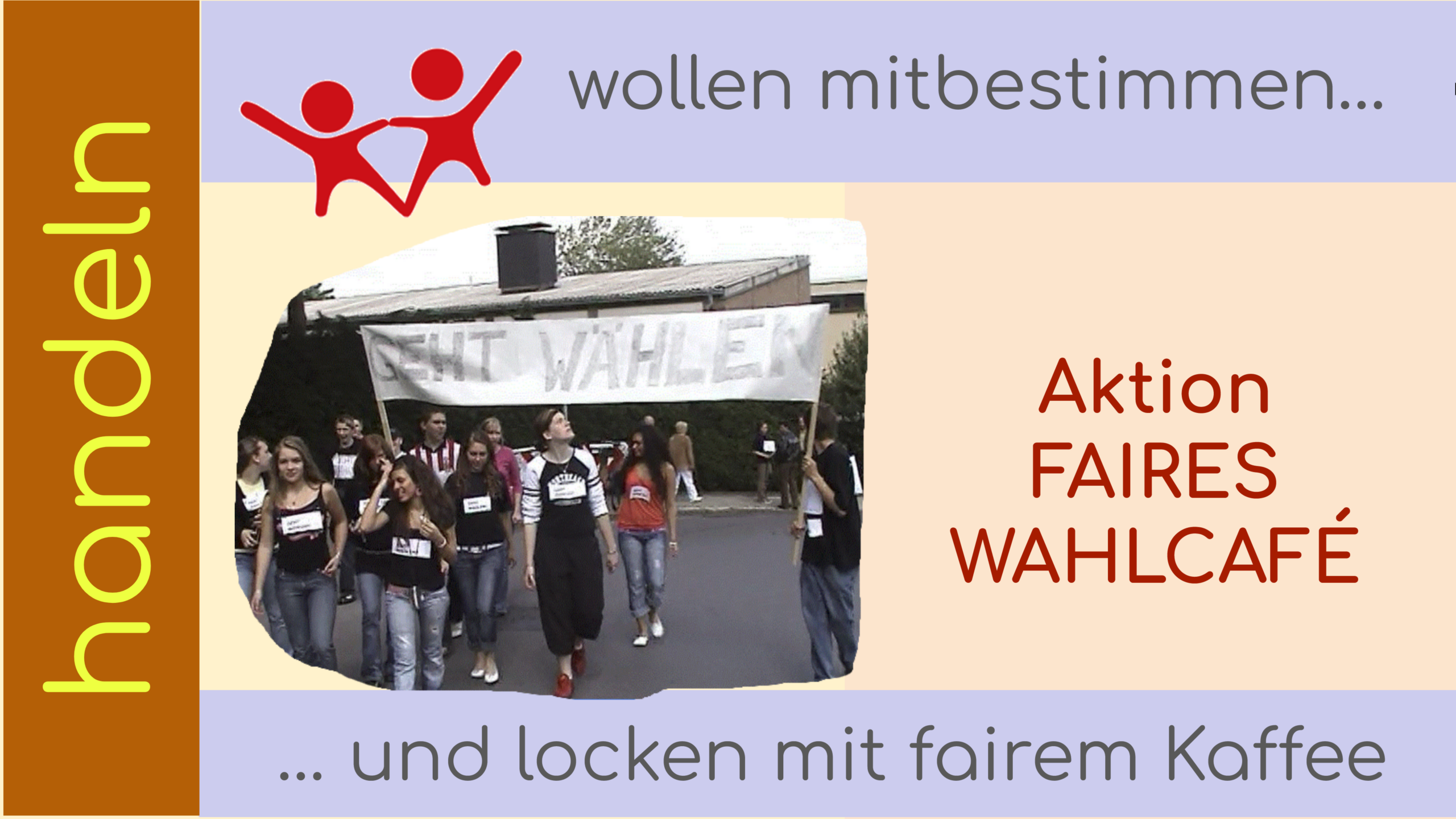 Seit 2005 bitten wir Schulen, in denen ein Wahllokal eingerichtet wird, Faires Wahlcafés einzurichten. Damit wird Kindern und Jugendlichen die Tür zum Wählen ein wenig geöffnet. Bei Servieren von fair gehandeltem Kaffe und selbstgemachten Kuchen, finden die Jugendlichen ihre Möglichkeiten, Denkanstöße zu geben.